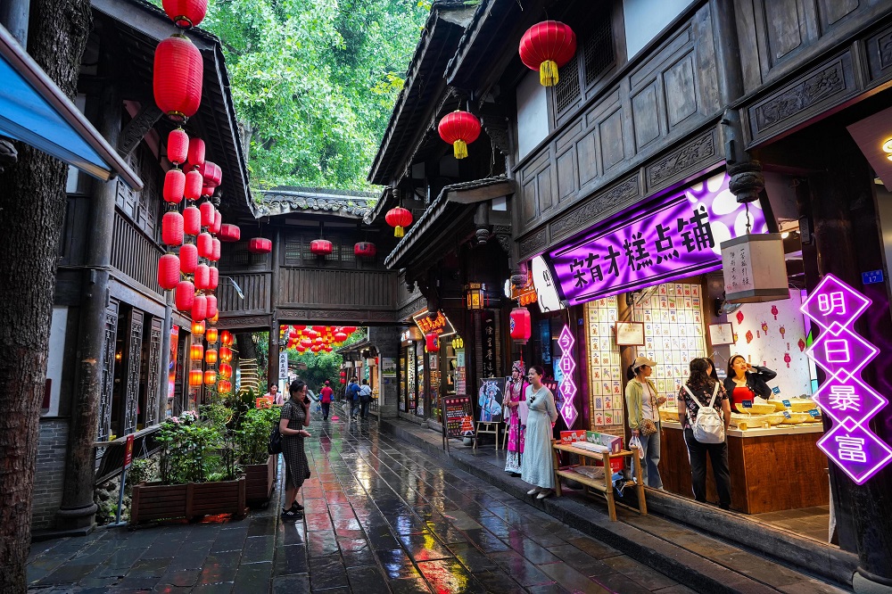 Salís del santuario de pandas y te adentrás en otro tipo de magia: la Calle Jinli, una de las calles comerciales más antiguas de China con más de 2.000 años de historia. Este paseo peatonal de aproximadamente 550 metros te catapulta directamente a la dinastía Qing, con sus construcciones de madera oscura, faroles rojos colgantes y techos de tejas que parecen sacados de una película de artes marciales.