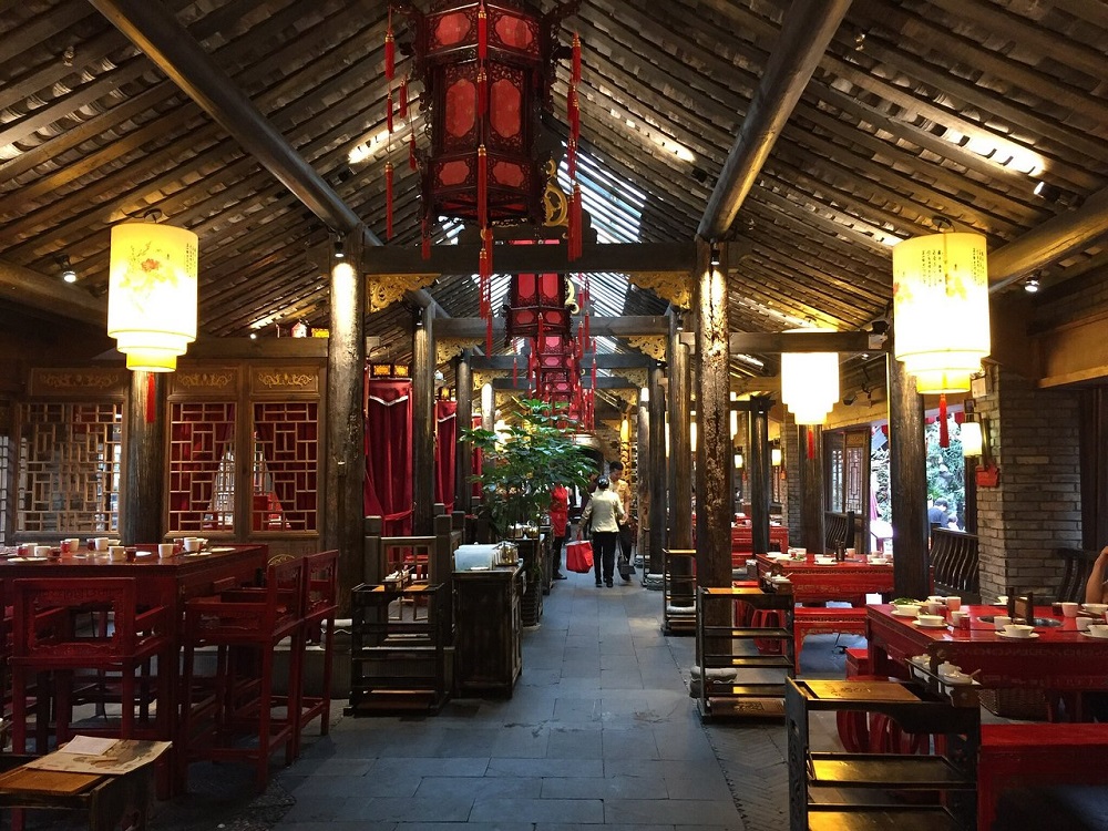 El Parque del Pueblo (Renmin Park) alberga algunas de las casas de té más tradicionales de la ciudad. Llegás y te encontrás con un patio al aire libre lleno de sillas de bambú donde cientos de chengduenses pasan sus tardes sorbiendo té, jugando cartas, o simplemente charlando con amigos. Los meseros circulan con teteras de pico largo (algunas de más de un metro), sirviendo agua caliente con movimientos acrobáticos que parecen coreografiados. Es un espectáculo de precisión donde el agua hirviendo cae desde un metro de altura directamente en tu taza sin derramar una gota.