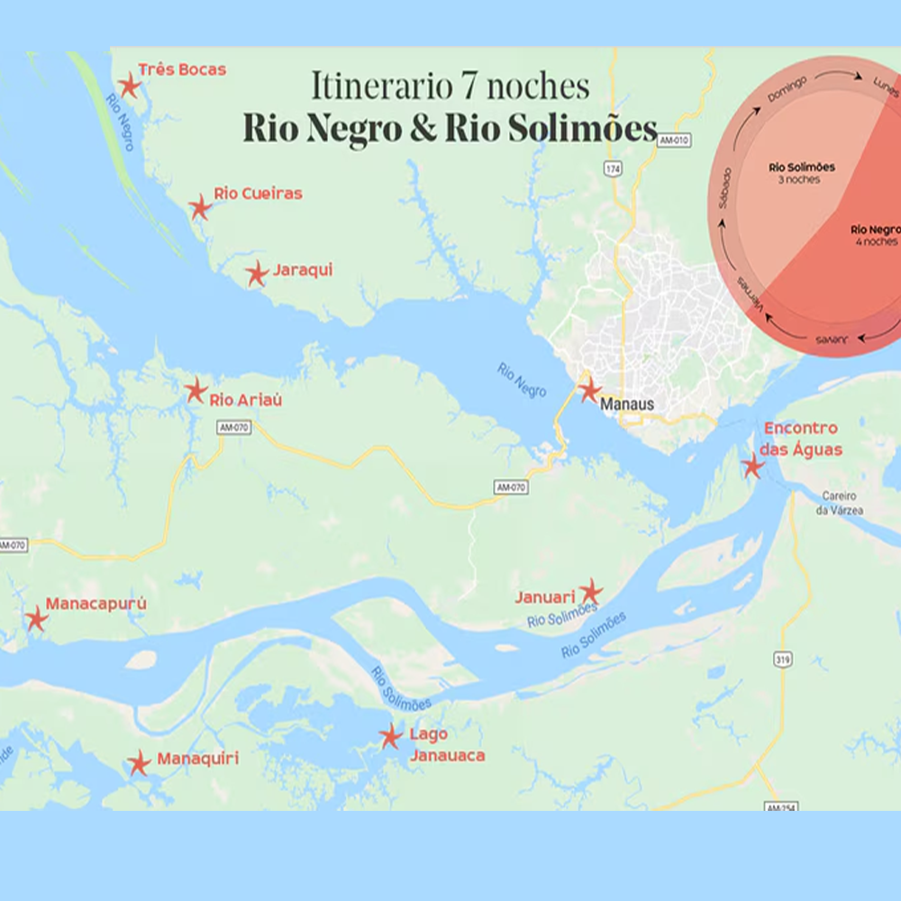 La aventura comienza con un vuelo desde Buenos Aires hacia Manaos, vía São Paulo, abriendo las puertas a una experiencia única en el corazón del Amazonas. Al llegar, un traslado regular conducirá a los pasajeros hacia su alojamiento para descansar y aclimatarse antes del inicio de la expedición.