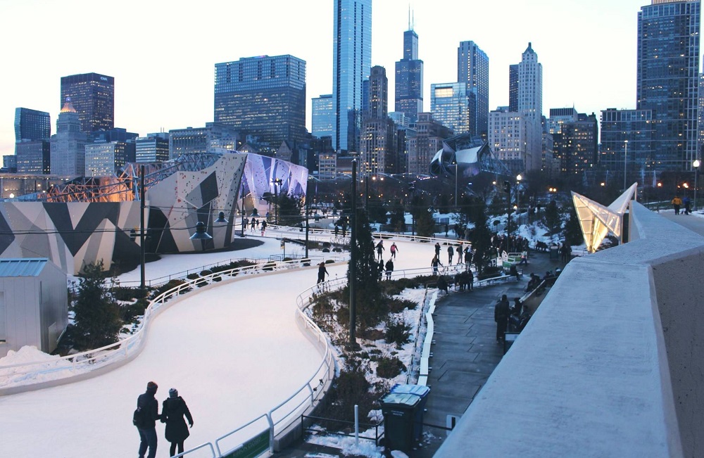 La pista de Millennium Park, ubicada junto al icónico Cloud Gate (esa escultura espejada que todos conocen como «The Bean»), es probablemente la más fotografiada de la ciudad. Imaginá esto: patinás en círculos, el hielo cruje suavemente bajo tus cuchillas, levantás la vista y te ves reflejado infinitamente en la superficie pulida del Bean, con el skyline de Chicago como telón de fondo. Es una experiencia casi cinematográfica. Lo mejor de todo es que el ingreso es gratuito; solo pagás el alquiler de los patines, que ronda los 15-20 dólares.